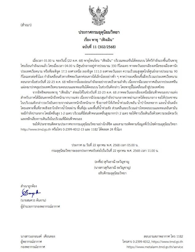 ประกาศ ณ วันที่ 22 ตุลาคม พ.ศ. 2568 เวลา 05.00 น. ทั้งนี้ กรมอุตุนิยมวิทยาจะออกประกาศฉบับต่อไปในวันที่ 22 ตุลาคม พ.ศ. 2568 เวลา 11.00 น.