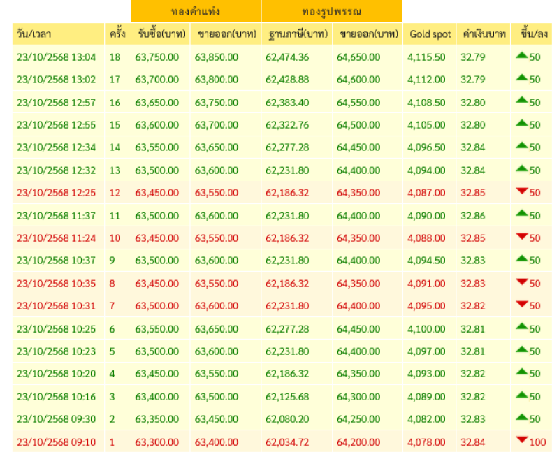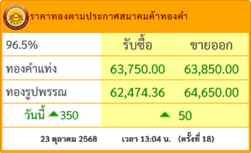 สำหรับราคาทองคำเปิดตลาดประจำวันที่ 23 ตุลาคม 2568 เปิดตลาดปรับลง 100 บาท ในครั้งที่1 ต่อมามีการปรับขึ้น-ลง รวมแล้ว 18 ครั้งแล้ว โดยทองรูปพรรณขายออกบาทละ 64,650.00 ตามข้อมูลจากเว็บไซต์ของ สมาคมค้าทองคำ เวลา 13:04 น.