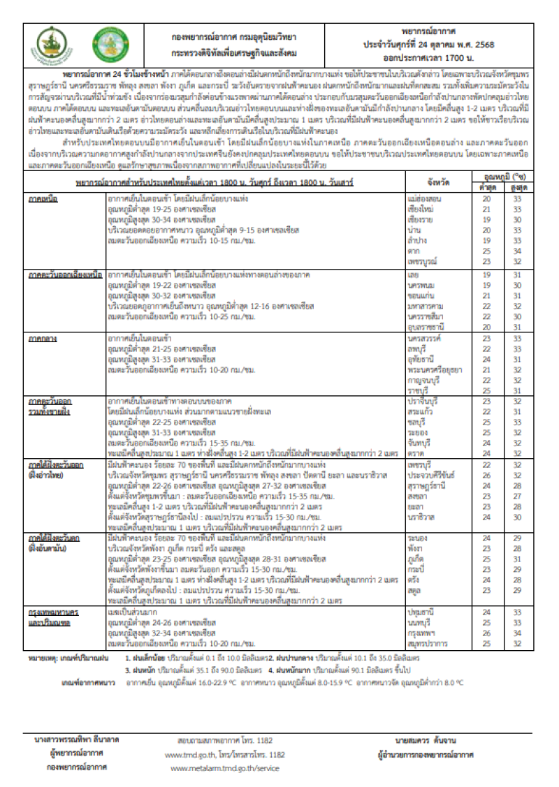 วันที่ 24 ตุลาคม 2568 ทางกรมอุตุนิยมวิทยาได้พยากรณ์อากาศ 24 ชั่วโมงข้างหน้า ภาคใต้ตอนกลางถึงตอนล่างมีฝนตกหนักถึงหนักมากบางแห่ง ขอให้ประชาชนในบริเวณดังกล่าว โดยเฉพาะบริเวณจังหวัดชุมพร สุราษฎร์ธานี นครศรีธรรมราช พัทลุง สงขลา พังงา ภูเก็ต และกระบี่ ระวังอันตรายจากฝนฟ้าคะนอง ฝนตกหนักถึงหนักมากและฝนที่ตกสะสม