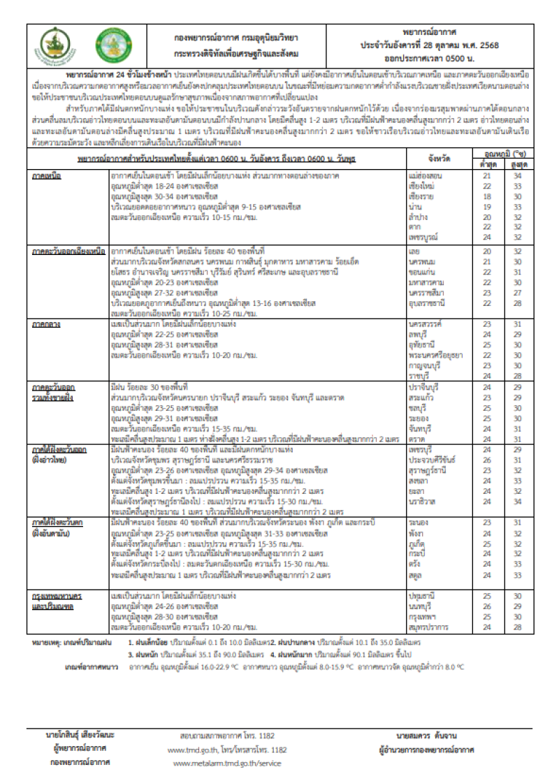วันที่ 28 ตุลาคม 2568 กรมอุตุนิยมวิทยาได้พยากรณ์อากาศ 24 ชั่วโมงข้างหน้า ประเทศไทยตอนบนมีฝนเกิดขึ้นได้บางพื้นที่ แต่ยังคงมีอากาศเย็นในตอนเช้าบริเวณภาคเหนือ และภาคตะวันออกเฉียงเหนือ
