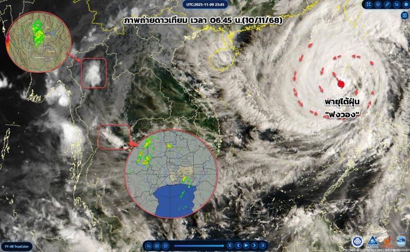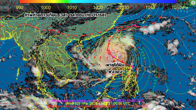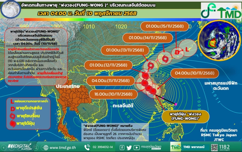 วันที่ 10 พ.ย. 68 กรมอุตุนิยมวิทยา อัปเดตเส้นทางพายุไต้ฝุ่น ฟงวอง(FUNG-WONG) วันนี้ (10/11/68): พายุนี้ได้เคลื่อนผ่านเกาะลูซอล ประเทศฟิลิปปินส์ ลงสู่ทะเลจีนใต้ตอนบนแล้ว กำลังเคลื่อนตัวทางตะวันตกเฉียงเหนือ ค่อนไปทางเหนือในเช้าตรู่วันนี้ (10 พ.ย.68)