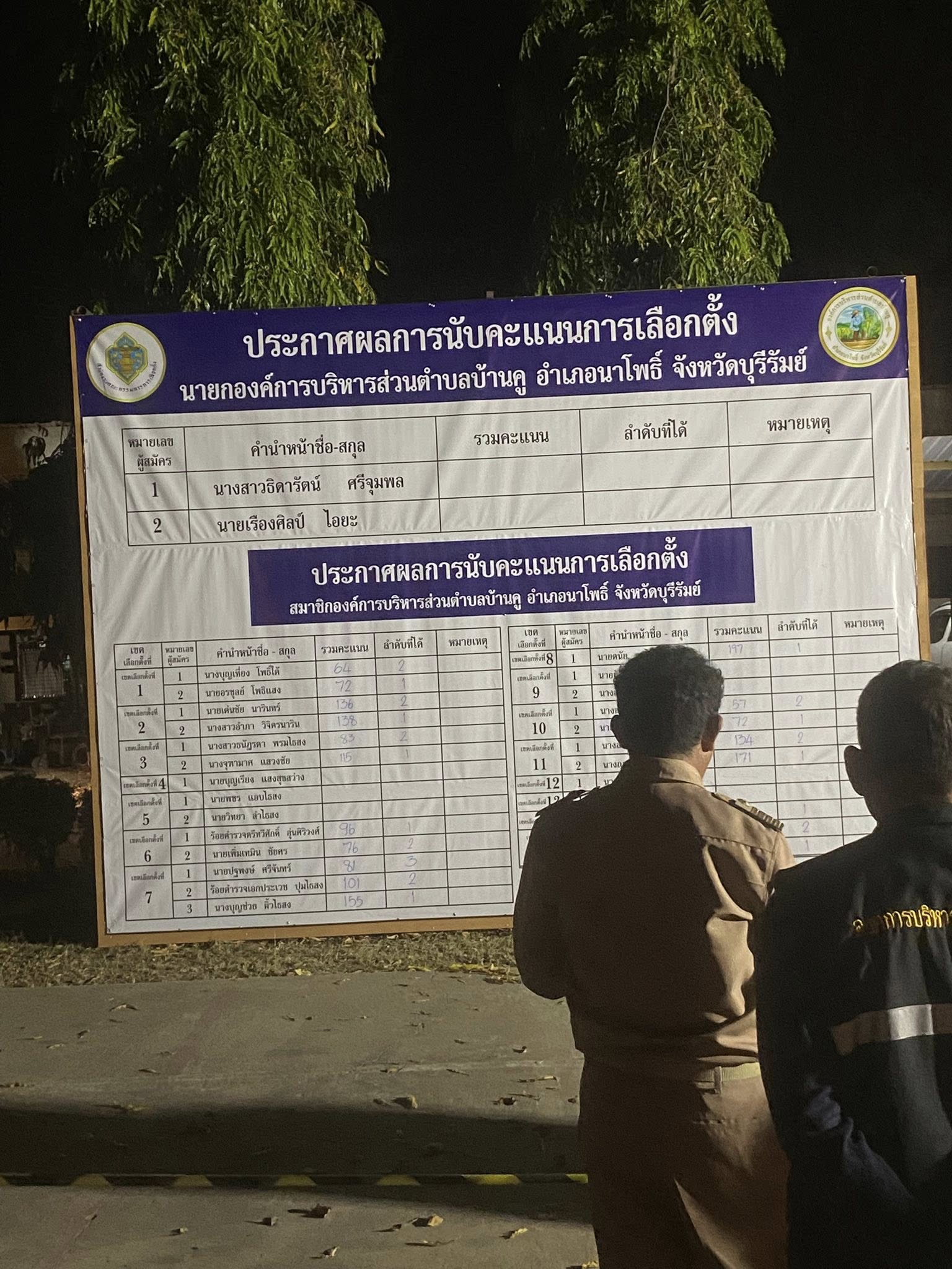 ผู้สื่อข่าวรายงานว่า การเลือกตั้งนายกและสมาชิก อบต. ในจังหวัดบุรีรัมย์ ทั้ง 133 แห่ง เริ่มทราบผลอย่างไม่เป็นทางการตั้งแต่เวลาประมาณ 20.00 น. โดยหลายพื้นที่มีการแข่งขันสูง แต่พื้นที่ที่ถูกจับตามองเป็นพิเศษคือ อบต.บ้านคู ซึ่งเป็นการขับเคี่ยวกันระหว่างนักร้องดังกับอดีตนายก อบต.