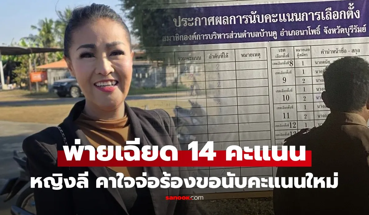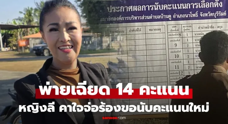 ผลการเลือกตั้งนายกองค์การบริหารส่วนตำบลบ้านคู จังหวัดบุรีรัมย์ สร้างความสนใจอย่างมาก หลัง “หญิงลี ศรีจุมพล” นักร้องลูกทุ่งอีสานชื่อดัง พ่ายแพ้แบบเฉียดฉิวเพียง 14 คะแนน เตรียมยื่นเรื่องต่อคณะกรรมการการเลือกตั้ง (กกต.) ขอให้นับคะแนนใหม่ เพื่อความสบายใจของทุกฝ่าย