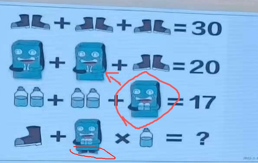 โจทย์ข้อนี้ถูกนำเสนอในรูปแบบภาพกราฟิกน่ารักๆ ประกอบด้วย รองเท้า กระเป๋าเป้ และขวดน้ำ โดยให้แก้สมการหาค่าของสิ่งของแต่ละอย่าง ดูเผินๆ เหมือนโจทย์ “แทนค่าแล้วตอบ” ทั่วไปที่เด็กประถมทำกัน