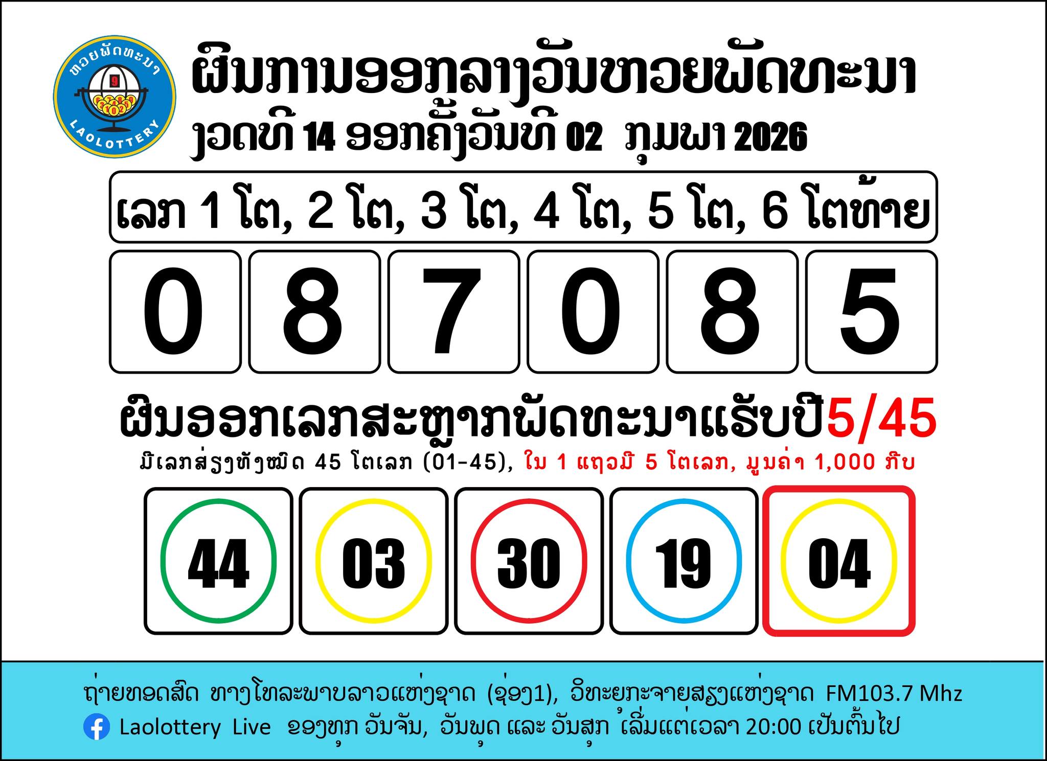 รายงานผลหวยลาว 2 กุมภาพันธ์ 2569 และผลหวยลาว 6 ตัว รวมถึงผลสลากพัฒนา ออกรางวัลดังนี้